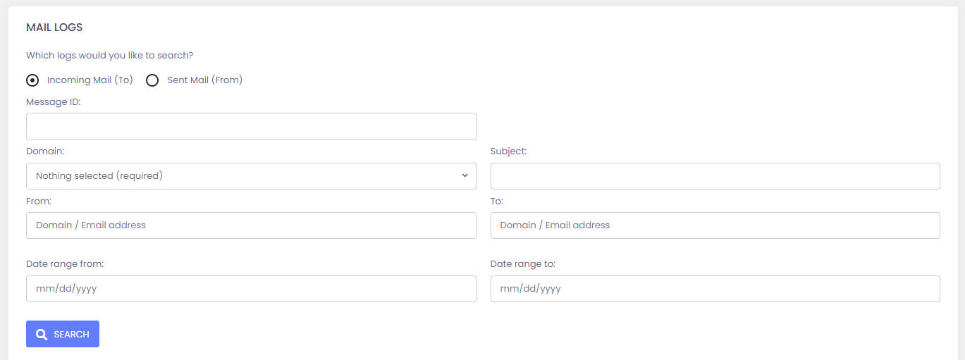 Domain* – Service Providers have a single panel of glass to manage all of their clients, and selecting a domain from the dropdown will limit the search to a single domain.