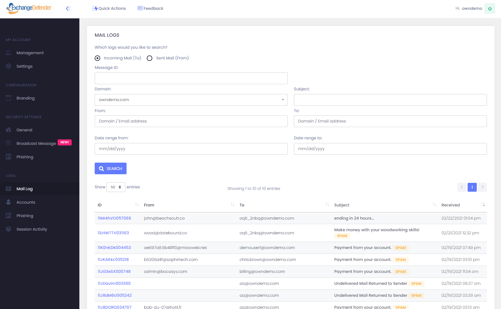 ExchangeDefender for Service Providers is meant for large scale ISPs and MSPs that want to centrally manage their entire client base. ExchangeDefender SMTP logs are available from the Mail Log link on the left.
