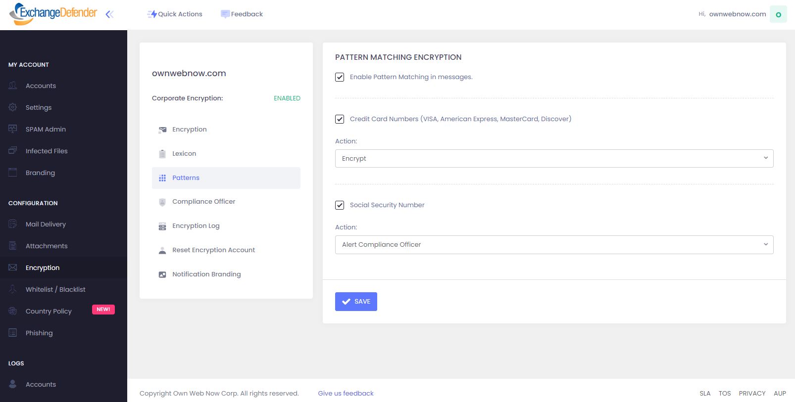 ExchangeDefender Corporate Encryption can detect patterns inside of outbound email and attachments and categorize them as credit card numbers, social security numbers, dates of birth or other company-specific account numbers. Each pattern can be assigned an automatic action to be taken once the message with protected content is detected.