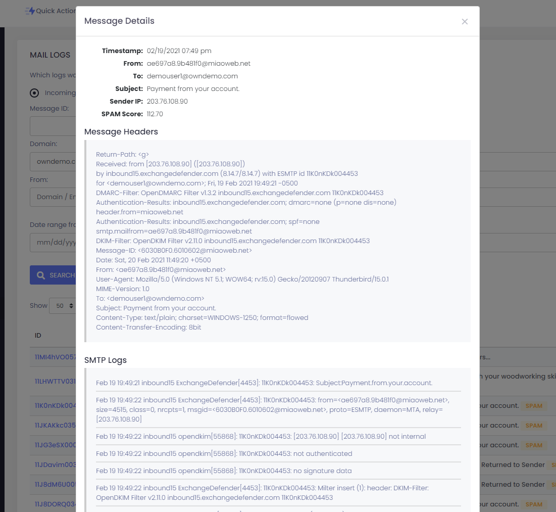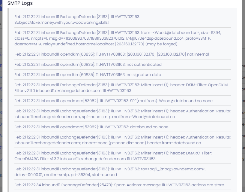 SMTP logs are transaction logs for the message as it goes through the ExchangeDefender network. Transaction logs get stamped by different security subsystems ExchangeDefender uses (for SPAM, DMARC, DKIM, and DNS validation) and the most important line in the messages is the very last one.